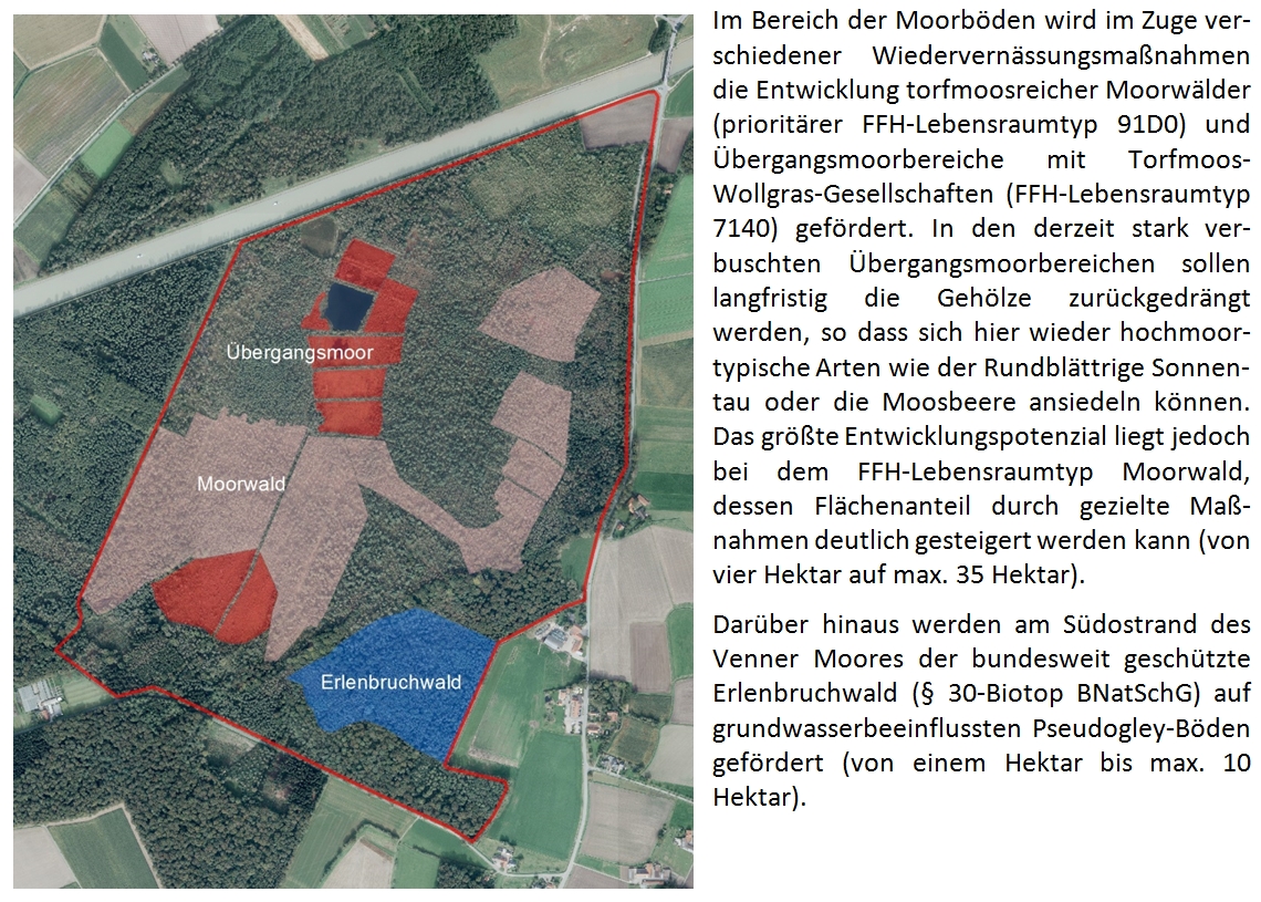 Ziel des Projektes ist die nachhaltige, naturnahe Anpassung feuchter Wälder und Moore an den Klimawandel. Im Venner Moor steht dabei die Optimierung des Wasserhaushaltes und die Revitalisierung des Hochmoores im Mittelpunkt.