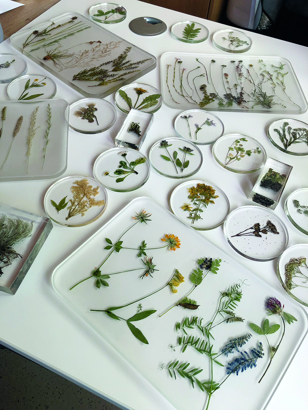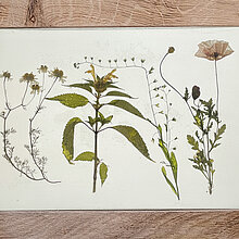 Inspiriert von historischen Herbarbelegen Bönninghausens aus dem Archiv des Naturkundemuseums Münster, wurde die traditionelle Technik der botanischen Konservierung weiterentwickelt: Nach sorgfältiger Bestimmung, Sammlung und Pressung wurden getrocknete Pflanzen in Epoxidharz eingebettet – ein Verfahren, das ihre filigrane Schönheit bewahrt und ihnen eine zeitlose Präsenz verleiht.