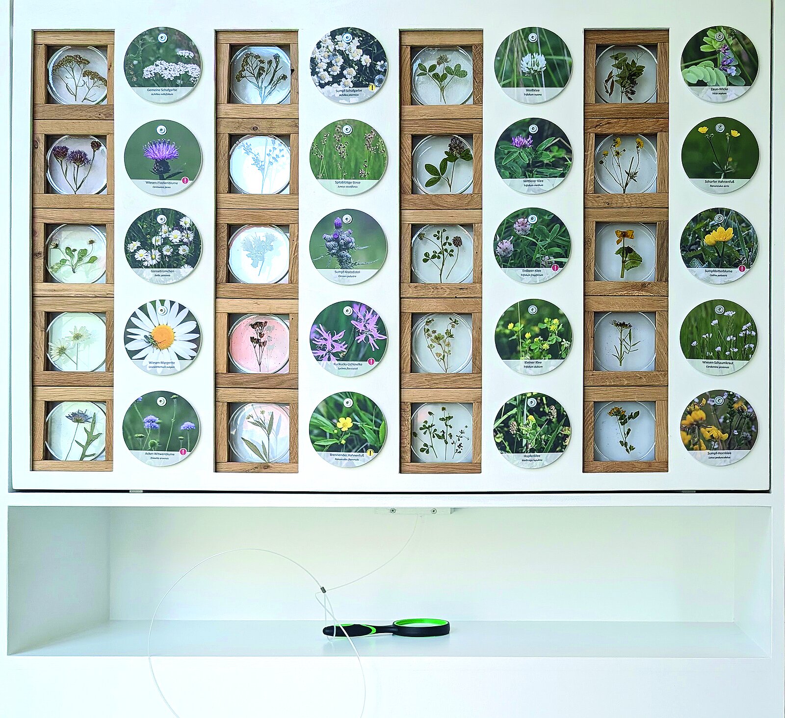 Jedes einzelne runde, in Harz gegossene Pflanzenexponat ist in einem stabilen, hölzernen Rahmen eingebaut. So kann man die Pflanzen besser anfassen und genauestens unter die Lupe nehmen. Zu jeder „Original“‐Pflanze gibt es ein auf einem Kunststoffkreis gedrucktes Foto mit dem botanischen und deutschen Namen … und die Information, ob eine Gefährdung vorliegt.