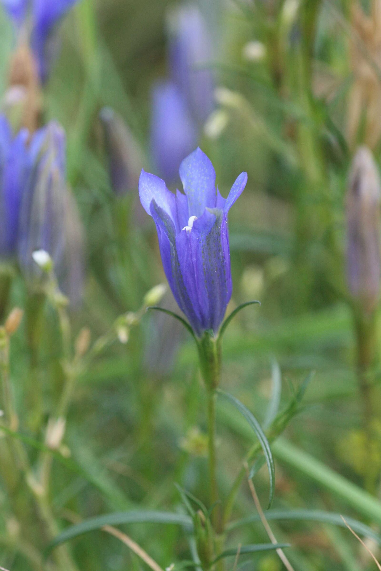 Der Lungen-Enzian (Gentiana pneumonanthe) ist eine mehrjährige, bis zu 60 cm hohe Pflanze mit aufrechten Stängeln und schmalen, gegenständig angeordneten Blättern, deren Ränder leicht umgerollt sind. Die tiefblauen, trichterförmigen Blüten erscheinen einzeln oder in kleinen Gruppen an der Spitze des Stängels und in den oberen Blattachseln – ein charakteristisches Bild spätblühender Feuchtwiesen im Spätsommer.