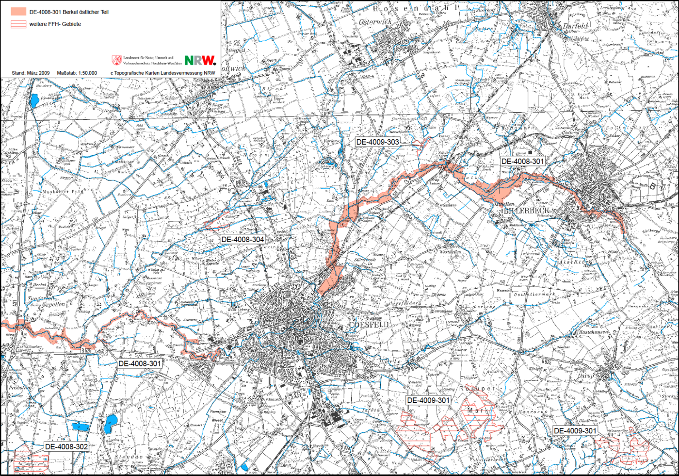 Darüber hinaus ist ein weitgehend zusammenhängender Berkelabschnitt von der Quelle bis Vreden als FFH-Gebiet Berkelaue unter europäischen Schutz gestellt worden. Mit dem FFH-Gebiet stehen insgesamt rund 64 km Gewässerlänge mit den angrenzenden Auenflächen unter Schutz. Hiervon befinden sich ca. 24 km im Kreis Coesfeld und weitere 40 km im Kreis Borken.