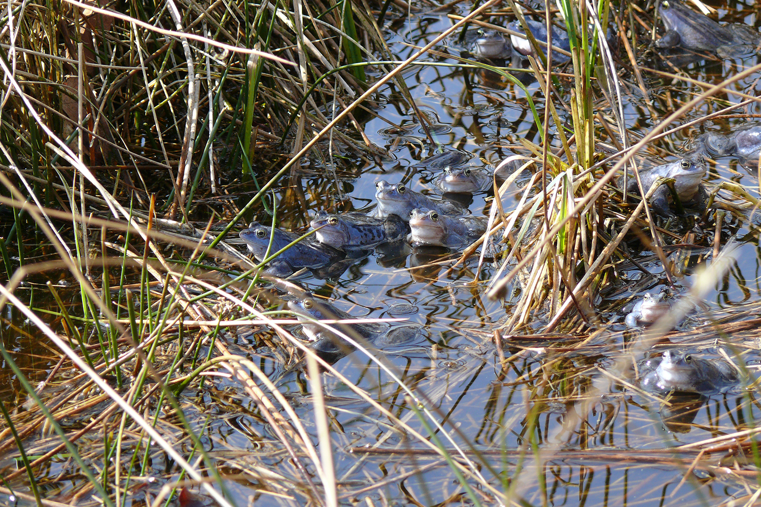 FFH Anhang IV-Art In der Zeit zwischen Anfang und Ende März wandern die Moorfrösche aus ihren Winterlebensräumen zu ihrem Laichgewässer, dem Heidesee. Im Gewässer angekommen, tritt die Blaufärbung der Männchen für kurze Zeit in Erscheinung. Ihr typischer Paarungsruf klingt wie das Blubbern einer unter Wasser gehaltenen, leeren Flasche. Nach der Paarung und Eiablage verlassen die erwachsenen Tiere das Gewässer und suchen ihre Sommerlebensräume auf. Der Moorfrosch hat in Westfalen seinen Verbreitungsschwerpunkt in den Heide- und Moorgebieten im deutsch-niederländischen bzw. westfälisch-niedersächsischen Grenzbereich in den Kreisen Borken und Steinfurt (Arbeitskreis Herpetofauna Kreis Borken 2005). Isoliert von diesem Verbreitungsschwerpunkt gelegene Vorkommen, wie die im NSG Heidesee oder in dem nur wenige Kilometer entfernt gelegenen NSG Fürstenkuhle (Kreis Borken), haben eine besondere Bedeutung für den Schutz dieser in NRW vom Aussterben bedrohten Art.