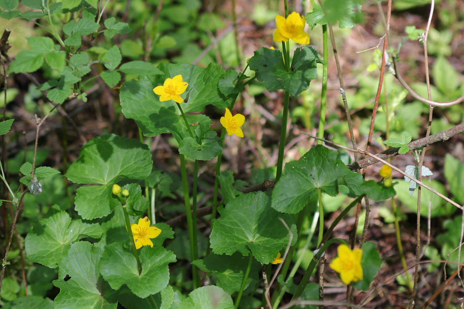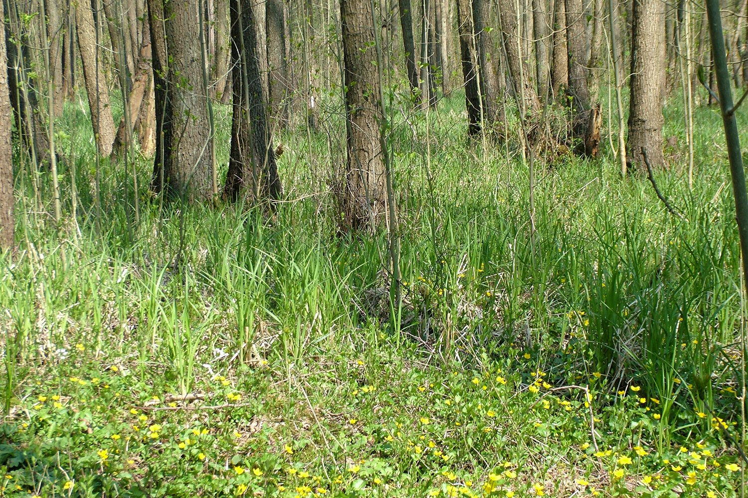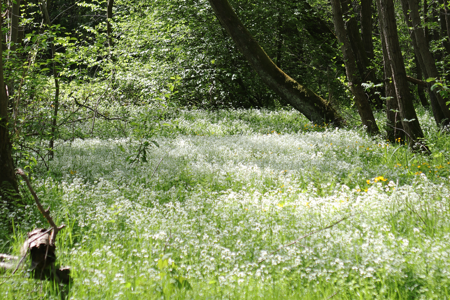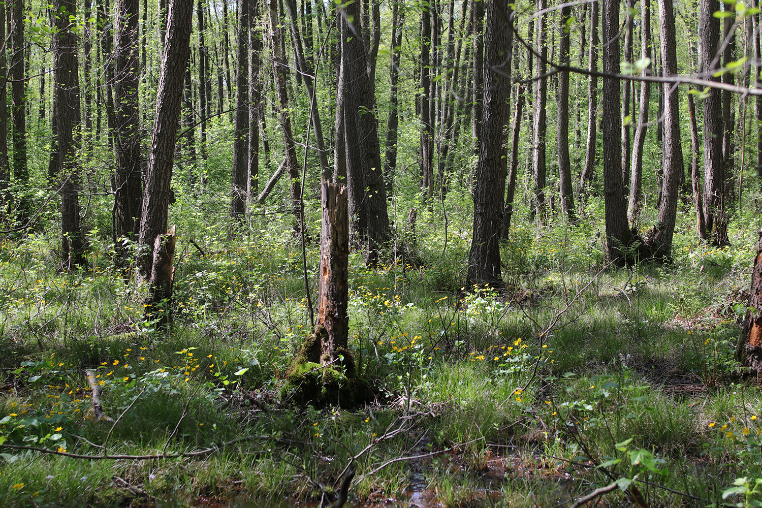 Im Frühjahr zeigt sich der naturnahe Erlenbruchwald (Alnetum glutinosae) entlang des Sand-Quellbaches mit seinem gelben Blütenteppich aus Sumpf-Dotterblumen (Caltha palustris) von seiner schönsten Seite. Auf dem staunassen Gleyboden sind in den zahlreichen Senken Teppiche mit Aufrechtem Merk (Berula erecta) ausgebildet.